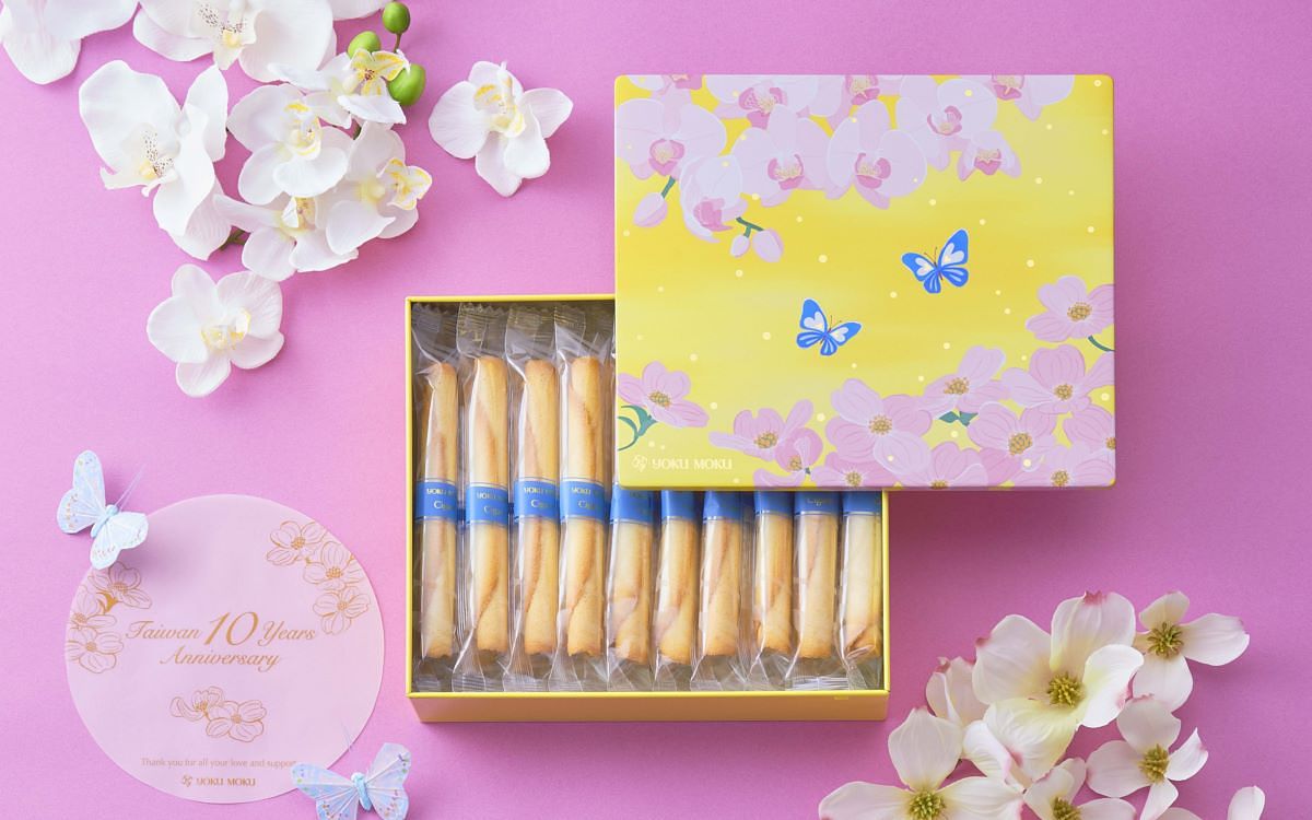 今年YOKU MOKU歡慶來台十周年,隆重推出「10周年台灣限定款」原味雪茄蛋捲禮盒,訴說著品牌在台灣十年間的感動與感謝,十週年的限定包裝特別結合代表品牌的山茱萸花和象徵台灣精神的蘭花,而一對翩翩起舞的蝴蝶穿梭於花叢間,象徵著人與人之間最親密的連結,透過YOKU MOKU一同舞出幸福協奏曲。