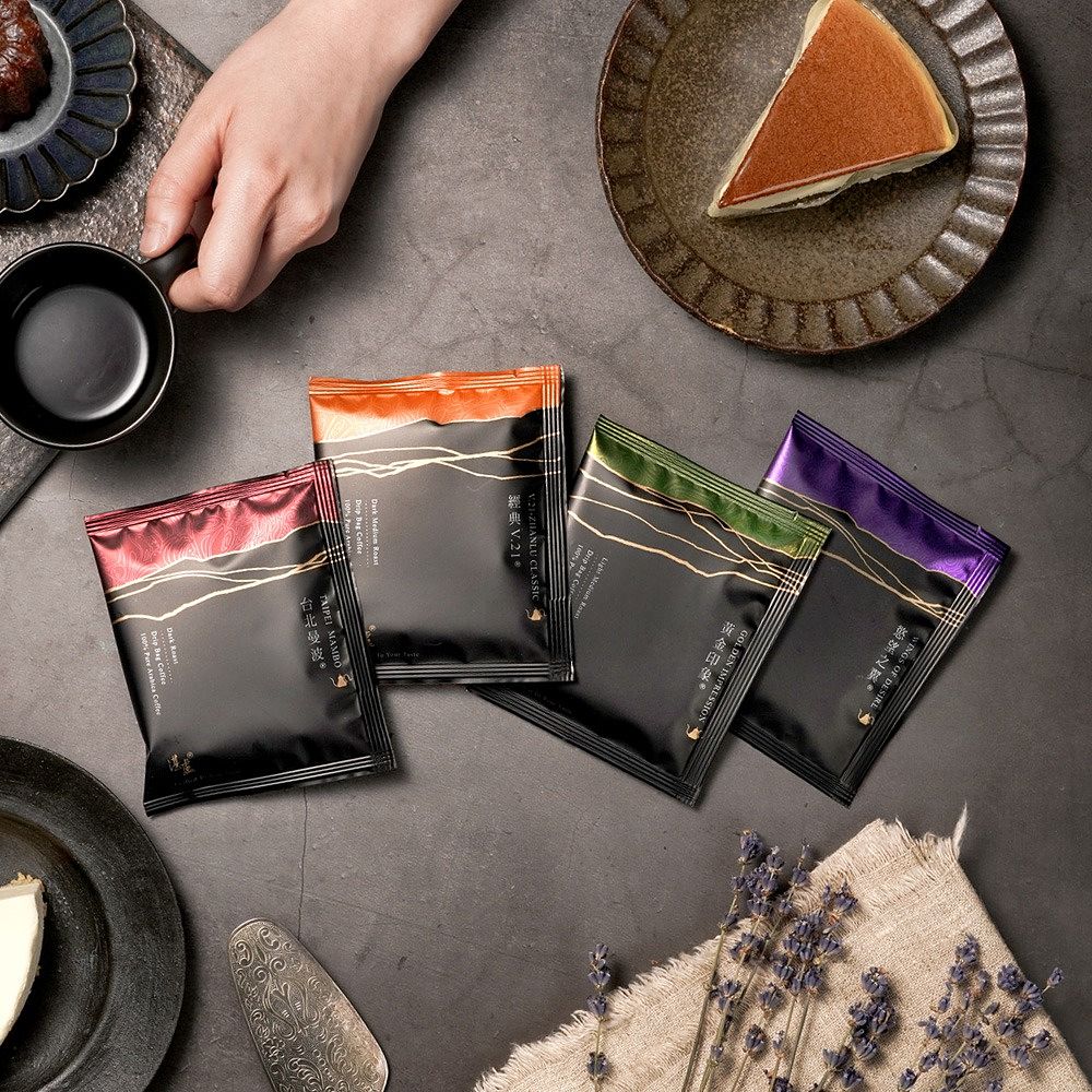 西達摩日曬、耶加雪菲水洗、哥倫比亞厭氧日曬、 巴拉拿帶漿果日曬各2包。獨特的濾泡包設計,沖泡形式類似茶包,事先將養好的咖啡豆研磨,再填充氮氣後裝袋,最適合沒有專業沖煮器具的辦公室或外出環境使用,去除了「沖煮」變因,精準還原我們設定的咖啡風味。