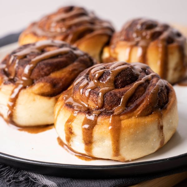 沒辦法買到名店肉桂捲,那就自己親手做吧!溫暖濃郁的肉桂糖填滿奶油麵團,組織綿密鬆軟,散發強烈甜味,頂部淋上濃郁的新竹寶山黑糖,將肉桂的馥郁香氣再提升一個層次,黑糖滴落的弧線及誘人的光澤感十分誘人,一口咬下幸福感爆棚,根本停不下來。