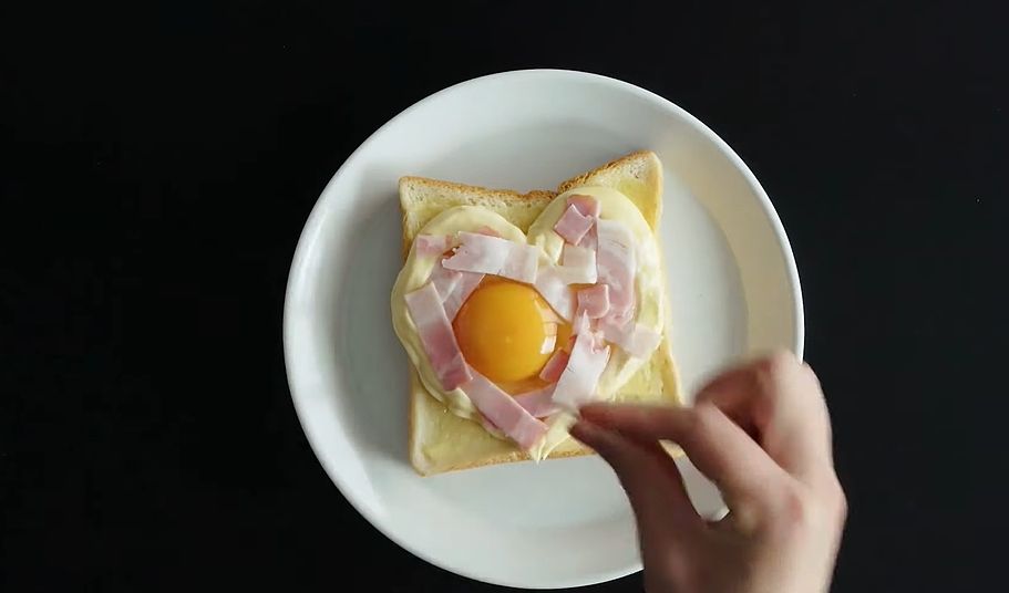 STEP3. 把培根(或是玉米、鮪魚) 裝飾在蛋黃的四周