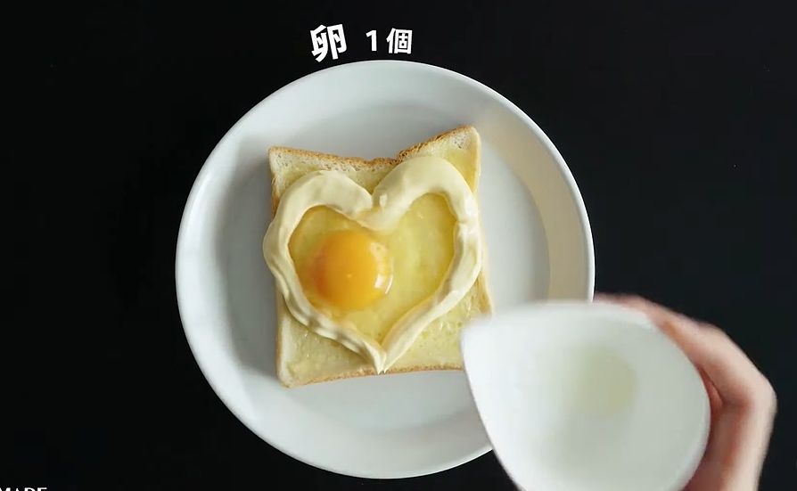 STEP2. 在吐司邊緣擠上美乃滋裝飾邊緣,將生雞蛋打在美乃滋的框框中,並且用牙籤戳一下蛋黃,避免加熱時蛋爆開