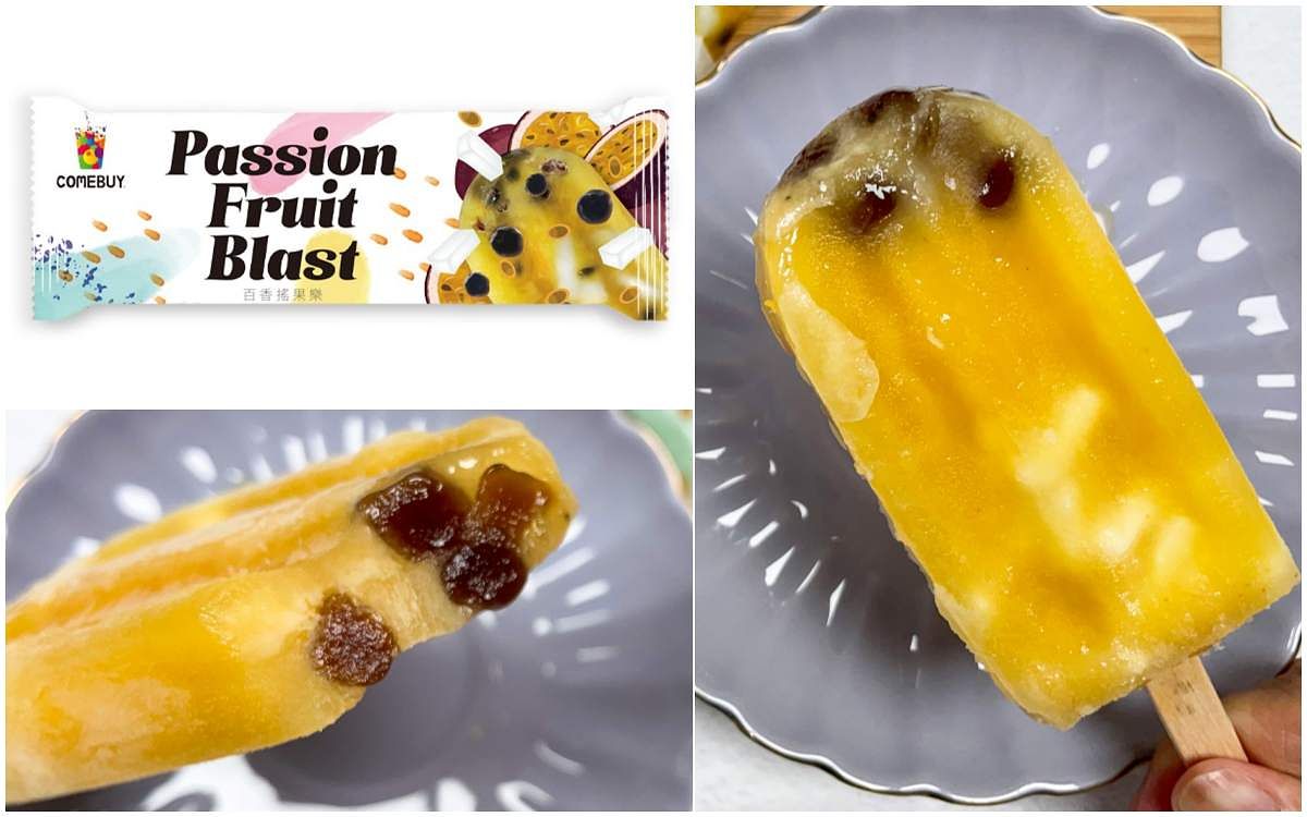 COMEBUY的鮮果調飲經典「百香搖果樂」 變成雪糕,以百香綠茶為基底,加入黑糖珍珠與椰果配料,酸酸甜甜的多層次口感,吃一支就能獲得大滿足。