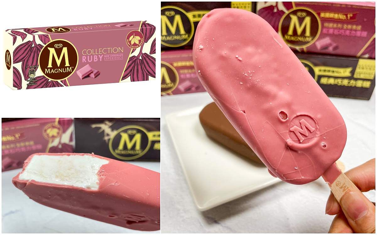 世界首創使用紅寶石可可豆製作雪糕產品,白巧克力冰淇淋內餡,外層搭配酸甜覆盆子果醬,呈現具有質感的粉色系冰品。
