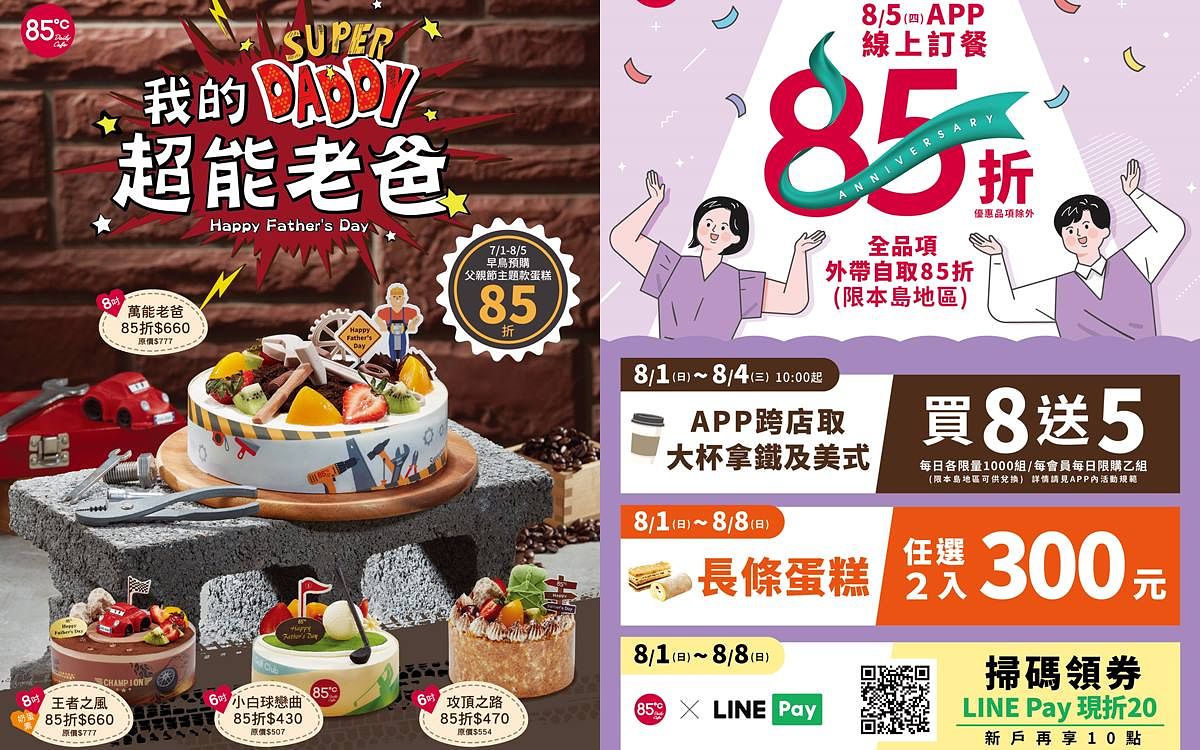 父親節想要給爸爸不一樣的驚喜嗎? 85ºC以「超能老爸」為主題,推出四款造型蛋糕和一款隱藏限量版「紳士老爹」千層蛋糕,其中四款造型蛋糕包括8吋「萬能老爸」蛋糕,讚嘆老爸甚麼都會、甚麼都難不倒;6吋「小白球戀曲」帶老爸來到超擬真高爾夫球場一桿進洞;還有為喜歡賽車或登山的爸爸獻上「王者之風」和「攻頂之路」,不同造型與口感。要給辛苦的老爸不一樣的驚喜!7/1到8/5預購主題蛋糕,即享85折優惠;7/1-8/8只要您是85Cafe App註冊會員購買主題蛋糕,還可再抽SONY PS5、TWINBIRD 手沖咖啡機、Marshall藍芽喇叭、tokuyo 智跑機、DOMETIC 行動冰箱、PHILIPS聲霸音響,預計活動檔期間全台可售出四萬二千個主題蛋糕。