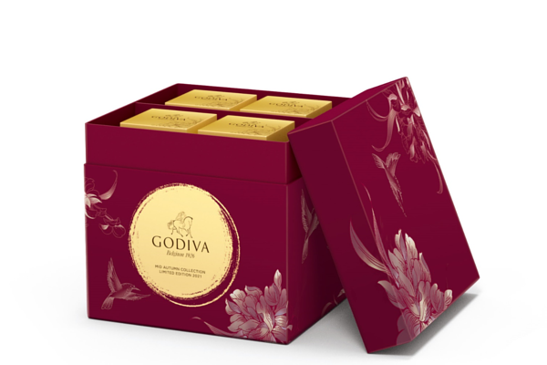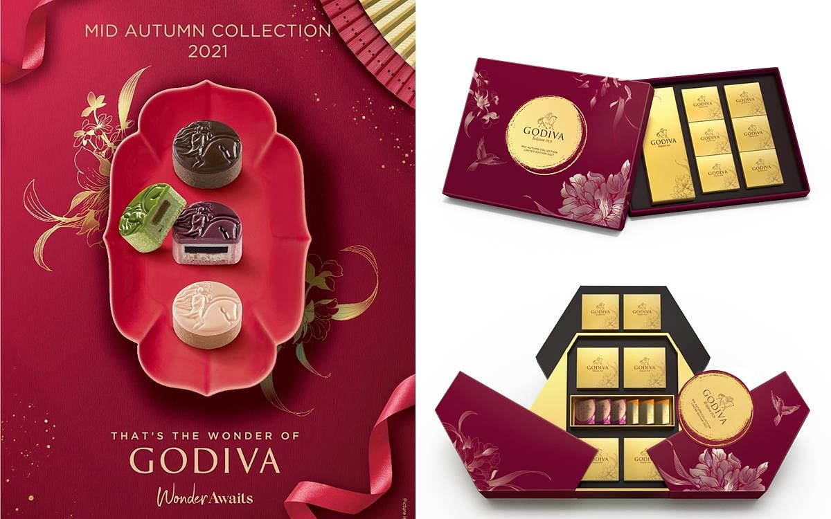 GODIVA 2021中秋系列禮盒延續去年花好月圓的設計概念,在細節上更精益求精,採用全新紅、玫瑰金及深藍等色調,襯托帶有品牌標誌的盈盈滿月;外盒綴以兼顧時尚與當代美學意蘊的工筆劃圖案,更加彰顯非凡尊貴。