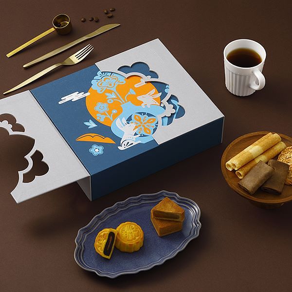 最受尊榮熟客期待的高價「月光寶盒」,每年外包裝材質都是一大亮點,今年以尊貴典雅為主題,盒身採用最具話題性的回收咖啡渣製成,搭配鏤刻的剪紙雕花設計,增加製作時的困難度與精緻感,每一盒都會附上一組專屬造型設計杯墊,兼具收藏與實用價值,是最受頂級顧客們喜愛的送禮選擇。內含有4款中西融合、創新經典兼具的月餅口味,包含去年最受歡迎的2款月餅—融合了奢華松露的「松露起司奶黃月餅」,與果香濃郁的甜點系「草莓乳酪奶皇月餅」;另外也準備了全新口味帶有香濃咖啡焦糖的「咖啡焦糖威士忌月餅」、及結合在地茶與松子香氣的「烏龍蓮蓉松子月餅」,4款各有不同風情;持續受到好評的「蝴蝶酥」,則推出紅玉紅茶蝴蝶酥,融合茶香與奶油香甜口感,令人食指大動回味無窮。
