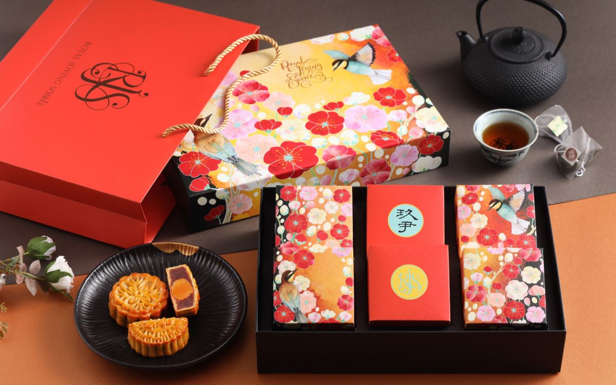玖尹今年首度推出中秋禮盒,包裝設計延續餐廳空間互動裝置藝術的花鳥圖騰,繽紛多彩、華麗精緻,更帶有中秋月圓花好的圓滿意涵,禮盒亮眼艷陽橘與沈穩深棕的搭配更顯大氣時尚,『禧月茶韻雙饗禮』希冀在疫情不安的一年,傳遞美好祝賀之情。