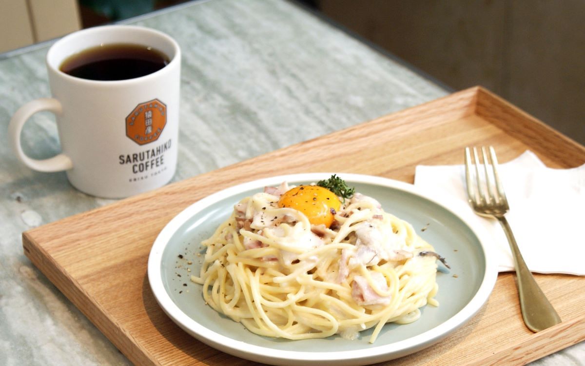 猿田彥珈琲|奶油培根白醬義大利麵|推薦價220元|信義店限定。