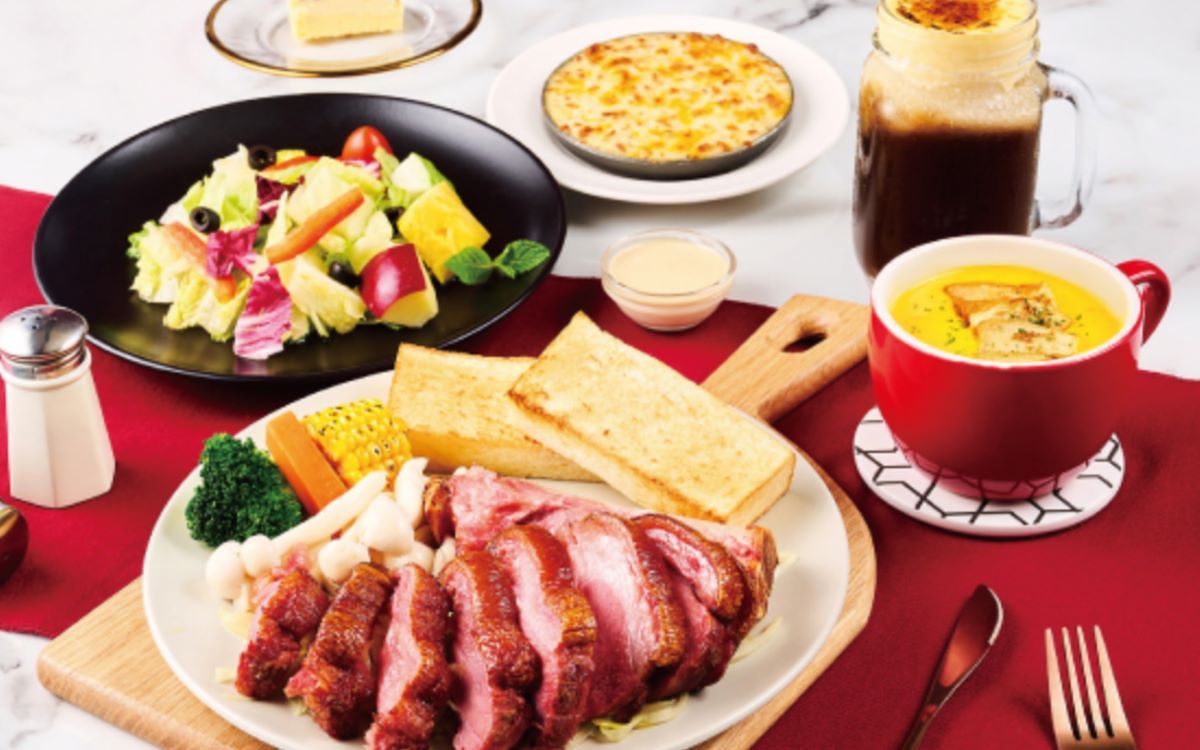全新輕套餐,一道主餐、五道副餐,含沙拉、麵包、濃湯、飲品及甜點,主餐經典菜色四選一:原塊牛排、松露牛排(New)、法式鴨胸起司魚排、德國豬腳等都是人氣品項,沙拉搭配當季水果與新鮮蔬菜、再附網友最愛-焗烤蘑菇方塊麵包,和杏鮑菇南瓜濃湯,精心配置的輕套餐售價$498元,外帶自取85折只要423元,即日起到8/31日隨時都能享受的滿足方案。