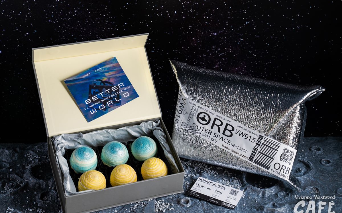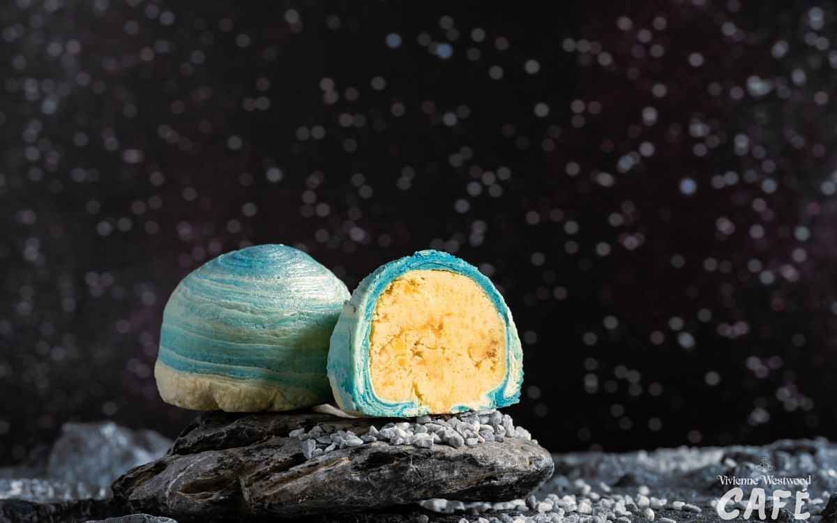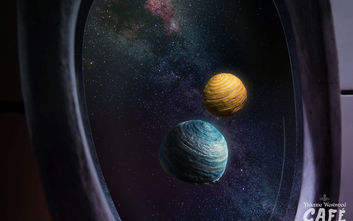 為勾勒出星際之旅與星際銀河感,主廚特以 Vivienne Westwood 象徵性的土星環標誌為靈感、模擬星球的外觀及顏色,因而誕生出藍白相間如水波紋粼粼閃耀,以及揮灑著暖褐與金黃相輝映的「星球酥」。藉由仿擬地球與土星的樣貌,期許每位收到的人,一同化為星際漫遊者,在閃耀著熠熠之芒的星河中恣意地探索,徜徉於浩瀚宇宙。