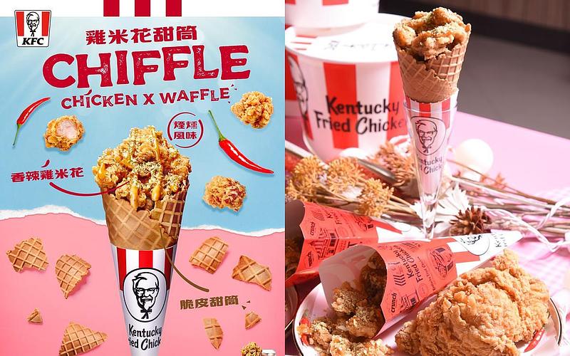 肯德基推出全新限定「Chiffle雞米花甜筒」,以Chicken X Waffle的概念,選用香酥脆皮的甜筒,裝滿鮮嫩多汁的雞米花,淋上香辣煙燻風味醬汁,再撒上奶油香酥的雪花片,一口咬下,獨特微辣的煙燻風味在嘴裡漫開,與酥脆的雞米花簡直絕配!越吃越開胃!而外型酷似加油棒的Chiffle雞米花甜筒,外型視覺比一般甜筒更顯巨大樂趣,搭配設計潮流感十足的手拿包裝,無論任何場合都能單手享用的潮流系甜筒,增添創意玩味體驗,手刀買起來,立馬來張社群網美吸睛照!