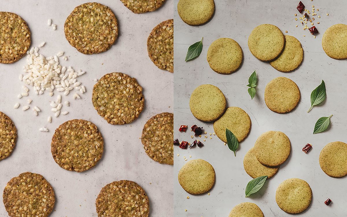 蔥已成為各式台灣料理必備調味,以不同型態出現在每道台灣小吃當中,而九層塔更是揚名國際台灣鹹酥雞必備調料,兩者皆是富含台灣底氣的特色香料。香蔥米餅選用甘甜細緻的宜蘭三星蔥以及蓬萊米香,烤成餅乾後口感酥脆味道鹹香;九層塔辣椒餅乾選用來自雲林和屏東的九層塔,溫暖氣候種出的九層塔無論芬芳度、鮮美度及品質都非常好,搭配些許辣椒粉,更能襯托草本香氣,吃起來辛香不刺激,咀嚼後九層塔香氣回韻,特殊風味讓人忍不住一片接一片。