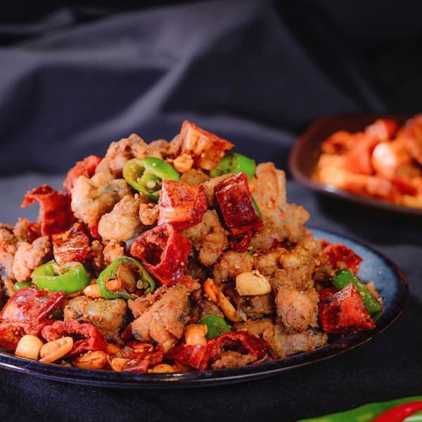 使用無骨雞腿肉及其他帶骨部位先香醃,再裹上麵漿猛火油炸至金黃酥脆,拌入脆辣椒,撒淋椒鹽、藤椒油,香氣四溢惹人垂涎,入口爽脆鹹香,麻香微辣,與視覺的火紅艷辣形成有趣的反差,令人驚喜!雞皮酥香肉質軟嫩,甘美肉汁封鎖在內,是道讓人一口接一口無法抗拒的絕妙涮嘴佳餚,不僅下飯,搭配啤酒亦十分過癮。