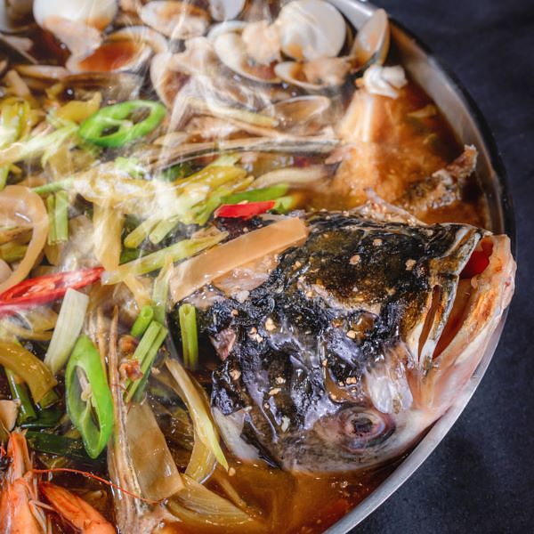選用重達五斤的大頭鰱,加入秘製醬汁、自製酸菜、慢熬大骨湯底,與蛤蜊、鮮活草蝦共煮,蝦貝鮮甜融入湯汁,吊出魚肉鮮味,大盤魚上桌時的大氣豐富震撼視覺,入口味蕾亦被極致鮮香滋味撼動。先享用蛤蜊、鮮蝦,再品嚐魚肉的細嫩爽滑,湯底味道清鮮,酸菜除了提鮮更顯爽口。亦可加海鮮、肉品、鍋料、時蔬入鍋同煮,份量十足,適合六人以上享用。
