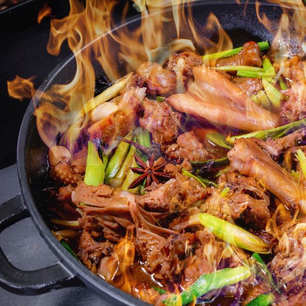 選用4~6個月大的台灣本地嘉文鵝,皮薄肉嫩,先以黃酒加入十餘種中藥材醃製入味,再以大量特選25度米酒加入秘製醬汁悶煮軟化肉質,上桌淋米酒點火燒出酒香,最後撒上蒜苗、芹菜,充滿儀式感的品享過程,吸睛醉人,撲鼻香氣惹人食指大動!鵝皮燒炙微焦,鵝肉飽吸醬汁與酒香,緊實香甜鮮嫩不死鹹,品享完醬味濃厚的鵝肉,加入大骨高湯及季節時蔬同煮,一鍋二吃,湯頭洋溢藥材溫潤香氣與酒香,滋味香濃尾韻回甘。