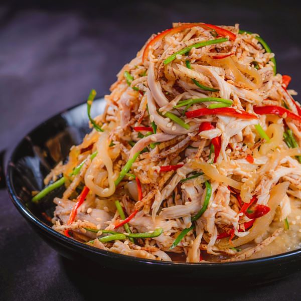 選用油脂及肉質軟硬適中、肉香濃郁的4~6個月仿土雞,先以花生油及薑塗抹按摩,增添肉質香氣與色澤,清蒸後手工撥絲,與炸芋頭絲、海蜇絲、香菜根拌入融合山葵、醬油、花生油與芝麻油的醬汁,最後撒上白芝麻,滋味爽口嗆香,交織雞肉的細嫩、海蜇的爽脆、芋頭的酥香、及香菜根清脆等多層次口感,酥脆芋頭絲讓整道料理口感更顯立體,清爽開胃。