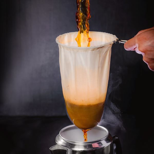 特選重烘焙與輕烘焙咖啡豆調配黃金比例,讓咖啡香氣濃厚卻不苦澀,入茶壺以傳統電餅爐煮製,同樣經過沖撞過程增加咖啡香氛釋放,微苦略酸咖啡加入香甜絲襪奶茶,融合咖啡香氣與茶韻,香醇濃滑,柔厚如緞。