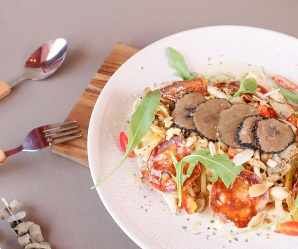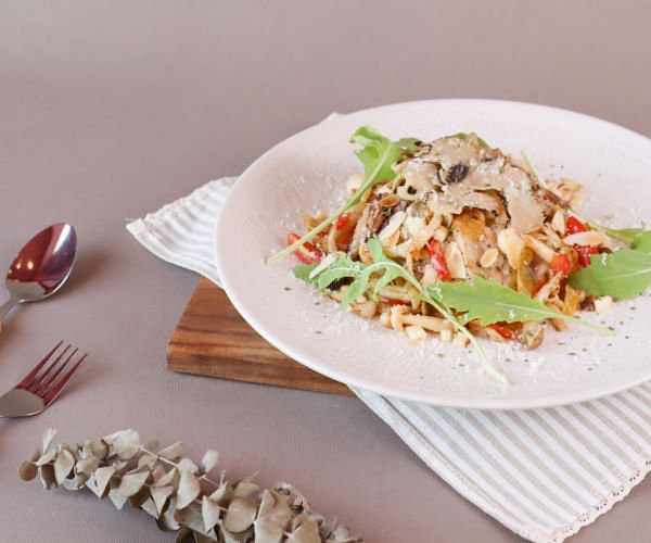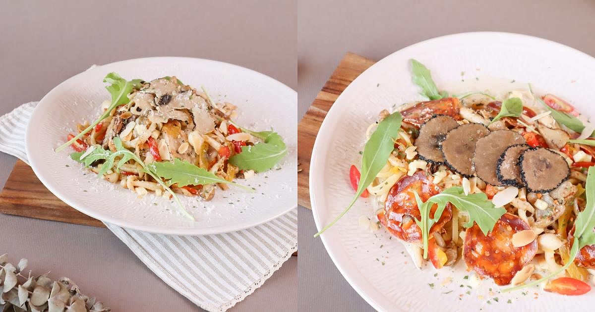 除了甜點之外,這次在義大利麵、燉飯及小點也同步進行升級,加入舉世聞名的奢華食材–松露及牛肝箘,在剛出爐的義大利麵及燉飯上,刨上一片片頂級松露,松露藉由餐點上升的熱氣,烘托出特有的醇厚香氣,讓整體風味層次更加高級、精緻。此外無辣不歡的朋友,可以選擇辣炒臘腸松露牛肝菌野菇奶油義大利麵,主廚特別將朝天椒、辣椒剁碎後,與義大利麵一起拌炒,增加香氣之餘卻不會過於嗆辣,喜歡吃辣千萬不能錯過。