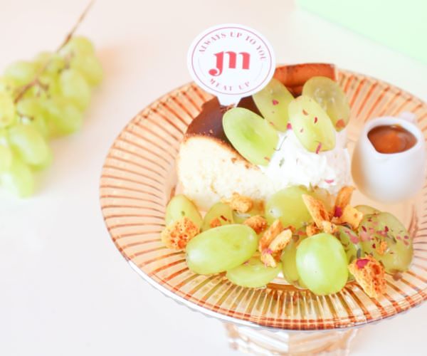 本次特別推出的『雲朵巨星舒芙蕾』,有別於一般舒芙蕾,烘烤時間較長,也因此外層呈現焦香澎鬆、內層則是半熟濕潤的軟嫩口感,直徑大小達20公分,視覺效果非常驚人,適合三五好友一同分食,同樣分為草莓及白葡萄可供選擇,根據不同口味,附上冰淇淋水果鹹乳酪杯,搭配著吃風味更豐富。此外Meat Up的另一項超人氣甜點—巴斯克乳酪蛋糕也推出新口味,入口滑順綿密的蛋糕體,搭配清甜日本白葡萄及馬斯卡彭乳酪醬,好吃的程度讓你捨不得與朋友分享,只想自己吃光光!