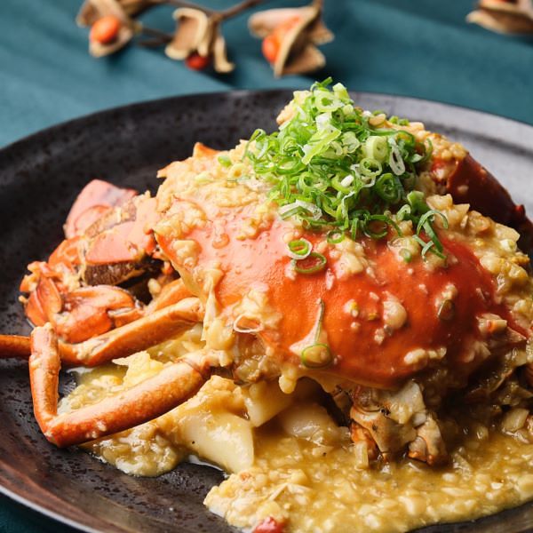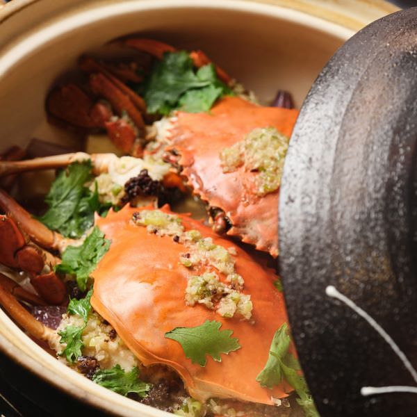 此道為經典粵式生焗蟹,蒜頭、紅蔥頭、乾蔥於砂鍋拌炒,放進新鮮紅蟳生焗,再加入自製蔥蒜蓉醬、豆豉醬、紹興酒悶煮,不加一滴水,鎖住紅蟳鮮甜原汁精華,起鍋前於鍋蓋淋上高粱酒點火炙燒增添酒香,蟹肉鮮嫩鹹香入味,飽滿蟹黃鹹鮮可口,是道兼具視覺、嗅覺、味覺的必饗佳餚。