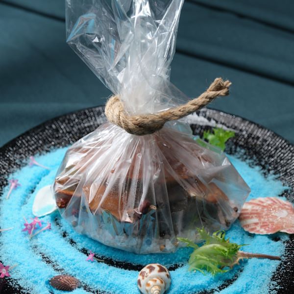 主廚將傳統鹽焗蟹改以耐高溫玻璃紙替代砂鍋,麻繩封綁,為整體擺盤視覺增添現代時尚感!粗鹽拌炒八角、丁香、桂皮、香葉、白胡椒、花椒等辛香料,放入浸泡過花雕酒的鮮活紅蟳焗熟,上桌宛如拆禮物般打開透明玻璃紙,香氣撲鼻,蟹肉纖細甘美,蟹黃鮮甜,飄散淡雅溫潤酒香。