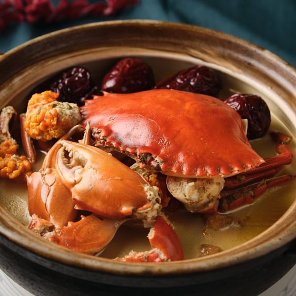 煎過的紅蟳與玉米雞,加入香醇濃郁雞湯原汁細火慢燉四小時,融合紅蟳鮮甜與玉米雞油脂香氣,呈現廣東佛山名菜『雞煲蟹』的湯濃味鮮,紅蟳肉質鮮甜膏黃濃郁、雞肉滑嫩爽口,微涼秋季嚐來最是溫暖脾胃。