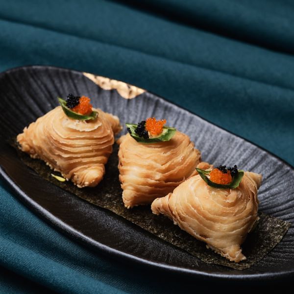 金黃酥脆外皮,包覆白醬與藍蟹肉、生食級干貝、白蝦、中卷等豐富海鮮,外層綴以芥末、蝦卵、魚籽,宛如西餐巧達濃湯般濃郁鮮香,為中西合璧的一款季節港點。