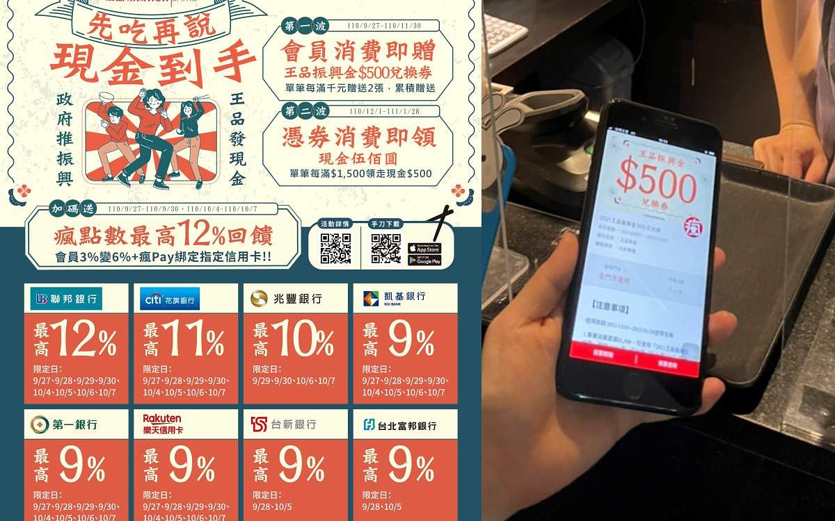 王品集團第一階段自9月27日至11月30日,凡是在王品集團旗下21品牌、275家門市消費金額滿1,000元,即可領「王品振興金500元兌換券」2張、滿2,000元4張…依此類推無上限。