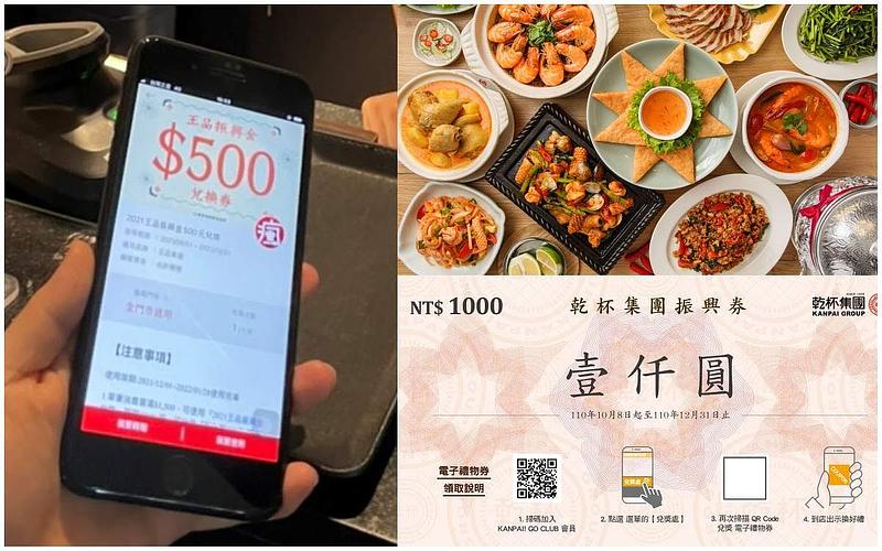 乾杯集團「振興贈千元」加碼活動,於10月8日起至11月30日期間,旗下七大餐飲品牌,包含乾杯燒肉居酒屋、乾杯Bar、老乾杯、和牛47、黑毛屋、黑毛屋本家、麻辣45,共計30間分店,持紙本振興券內用消費滿2,000元即贈「乾杯千元現金抵用券」,滿4,000元贈2張,以此類推。