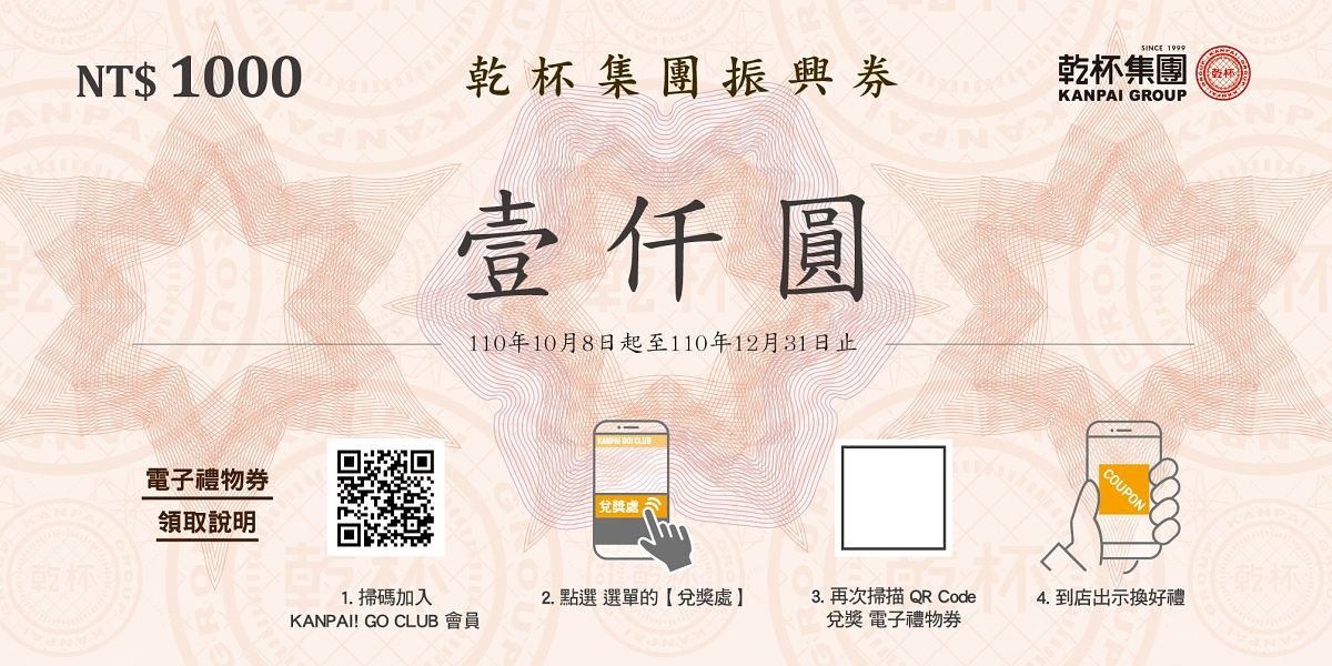 領取方式:至LINE官方帳號「KANPAI GO!CLUB」加入會員,輸入「乾杯千元抵用券」序號,即可領取面額4張的250元電子現金折抵券並儲存於官方會員帳號內。