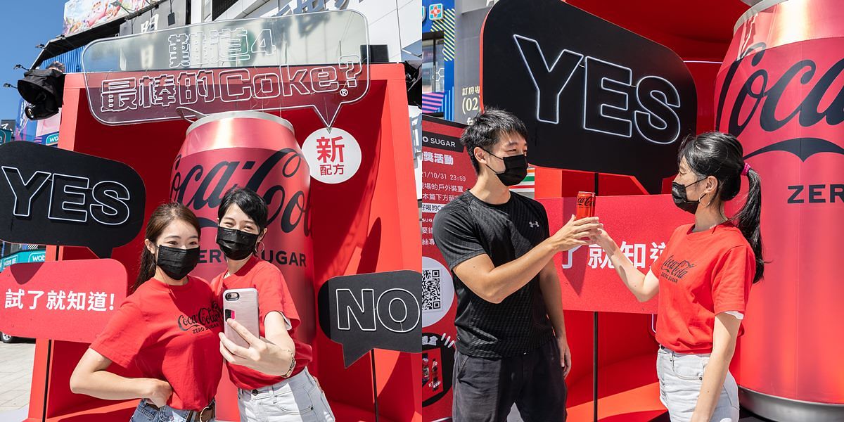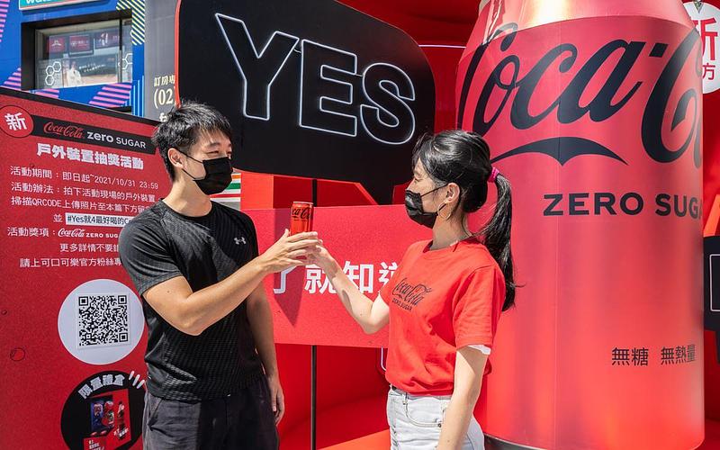 為了讓更多消費者享受到新「可口可樂」ZERO SUGAR(無糖)的暢快滋味,品牌打造擬真且等比放大的巨型鋁罐,坐落於西門町6號廣場,即日起至10月31日邀請消費者一同前來體驗嚐鮮。超吸睛的戶外互動裝置,以「難道4最棒的Coke ®?」為主題,消費者拍照上傳打卡就抽限量「可口可樂」ZERO SUGAR(無糖)互動禮盒組,每逢每周五、六、日消費者只要現場回答「Yes or No」,就可以直接換取一罐新「可口可樂」ZERO SUGAR(無糖),此外,消費者現場掃描QR code,至「可口可樂」LINE官方帳號(Coca-Cola隨時樂)體驗互動小遊戲,還有機會獲得各大電商的「可口可樂」系列產品優惠序號。