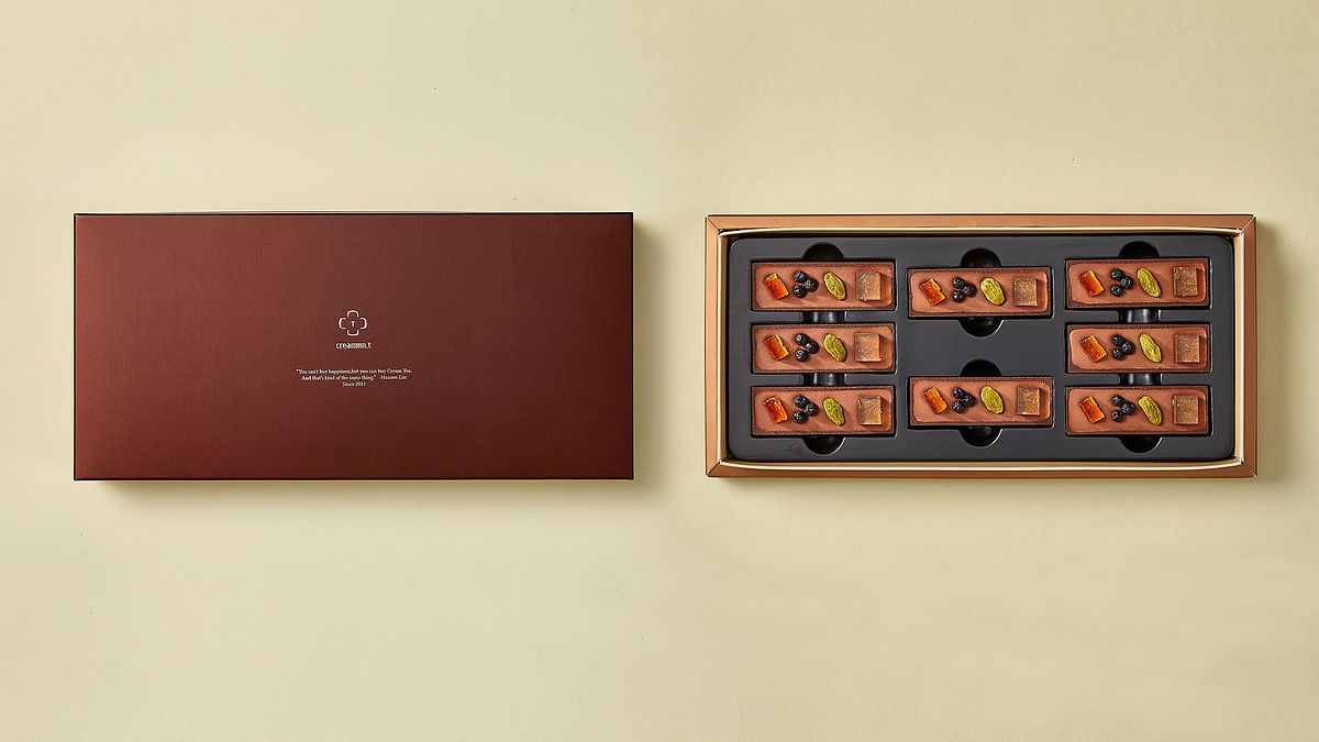 除了向金馬致敬,creammm.t也將備受foodie喜愛,被譽為「隱藏系招牌」的生巧塔更加精進,採用被譽為當今品質最好巧克力的《CLUIZEL柯茲巧克力》,其堅持只使用天然原料,並以追求最佳『Noble Ingredient』品質保證為目標,如同主廚Hannes身為職人的堅持。「creammm.t 風味生巧-日曬」 選用柯茲極致莊園系列的Laguna 70%拉谷納莊園黑巧克力為基底,以精品咖啡日曬耶加為設計靈感,以技術門檻極高的灌殼法,展現黑巧克力柔順香氣的基底外,一如電影的起‧承‧轉‧合,期望在舌尖展演具有層次與餘韻的苦甜平衡。選用蜂蜜檸檬法式軟糖、青提子、野生小藍莓,以及糖漬橘條等四種食材點綴,依序由主廚建議的品味順序入口,體驗宛如電影般的美味人生。精緻外觀如同珠寶盒,而長條造型維持精緻感外,更從方便性與午茶情境設想,十足儀式感與至親好友共享難得的Me time時光。