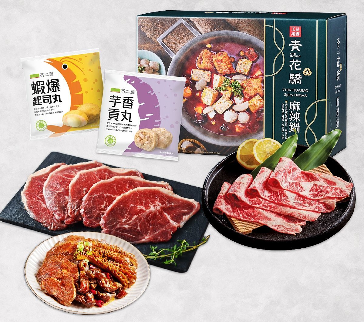 內含青花驕經典麻辣鍋、美國嫩肩里肌薄切牛肉片、石二鍋芋香貢丸、石二鍋蝦爆起司丸、麻佬大大紅袍麻辣牛三寶,小家庭聚會必備。