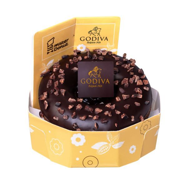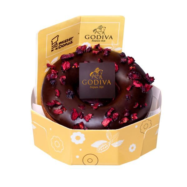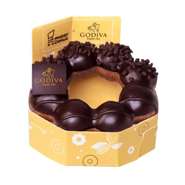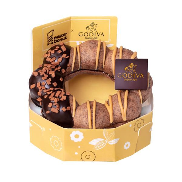 為傳遞高雅且奢華的品牌意象,特別以純粹、經典、細緻為開發核心,勾勒出精品級甜甜圈,讓消費者入口即能感受到奢華感與雙品牌的用心。本次合作共推出四款聯名甜甜圈,「GODIVA 可可夾心碎粒波堤圈」、「GODIVA 莓果夾心黑巧波堤圈」、「GODIVA 鹽焦糖可可波堤」、「GODIVA 迷你岩石形可可波堤」。嚴選低調且醇厚的GODIVA 黑巧克力,搭配Mister Donut 當家招牌Q彈「巧克力波堤」,佐以可可碎粒、鹽焦糖、莓果等食材點綴,最後再奢華放上整片GODIVA Logo巧克力片,打造可可香氣誘人,質感、濃度皆令人融化的成人式美味可可甜甜圈。不論是犒賞自己,或與親愛的家人、情人、朋友分享都超圈粉!