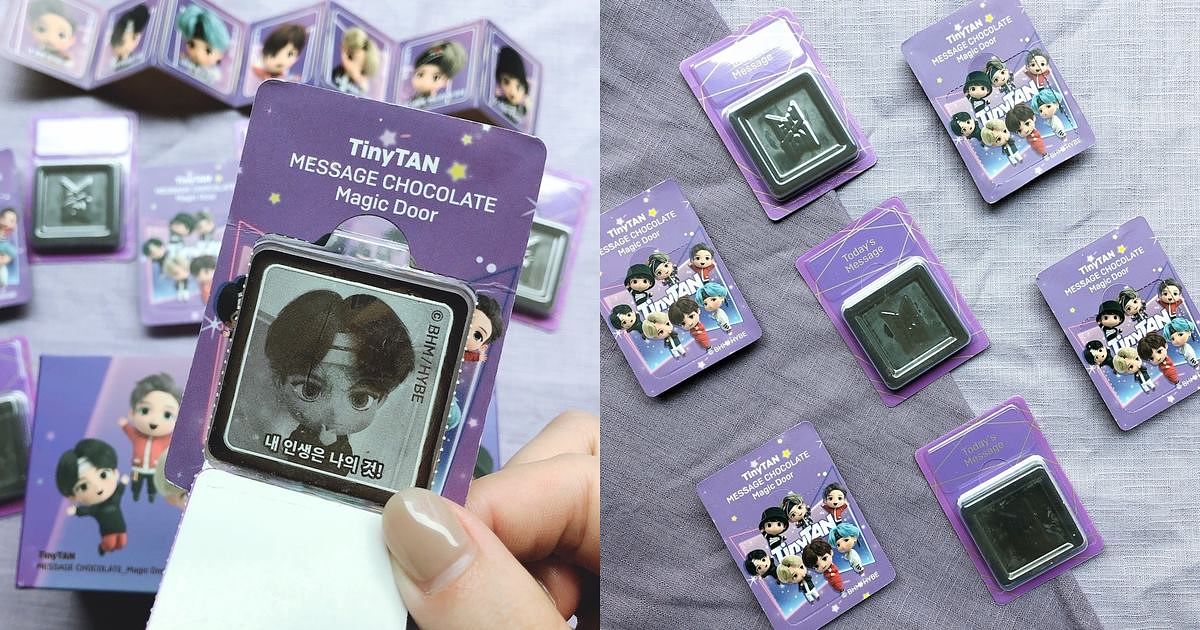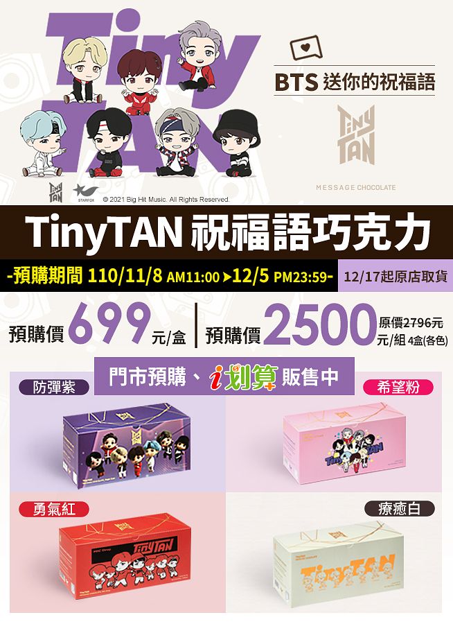 TinyTAN 祝福語巧克力分為4款顏色包裝,分別代表不同概念,包含希望與溫暖的「Magic Door」(紫色及粉色)、勇氣與鼓勵的「MIC Drop」(紅色)以及傳遞關懷和療癒感的「TinyTAN」(白色),每盒附送7張隨機祝福語貼紙、共有8片巧克力均為獨立包裝,當中7片印上防彈少年團成員的Q萌角色,及團員們傳遞的祝福字句(隨機7句,合計共49款),1片印有「TinyTAN」標誌,每盒售價699元。