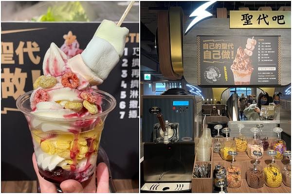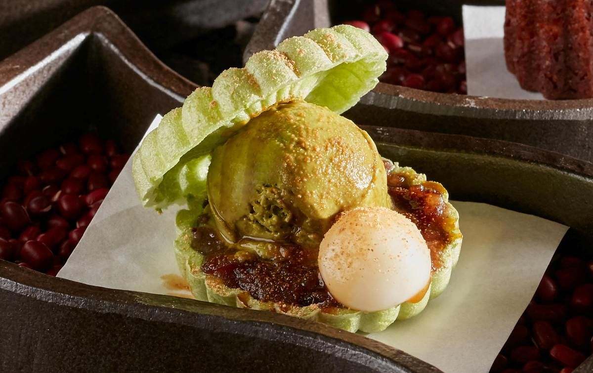 百年日本宮廷點心摩納卡夾入抹茶冰淇淋、紅豆泥與白玉,撒上黃豆粉一起享用。外層酥脆,內餡豐富