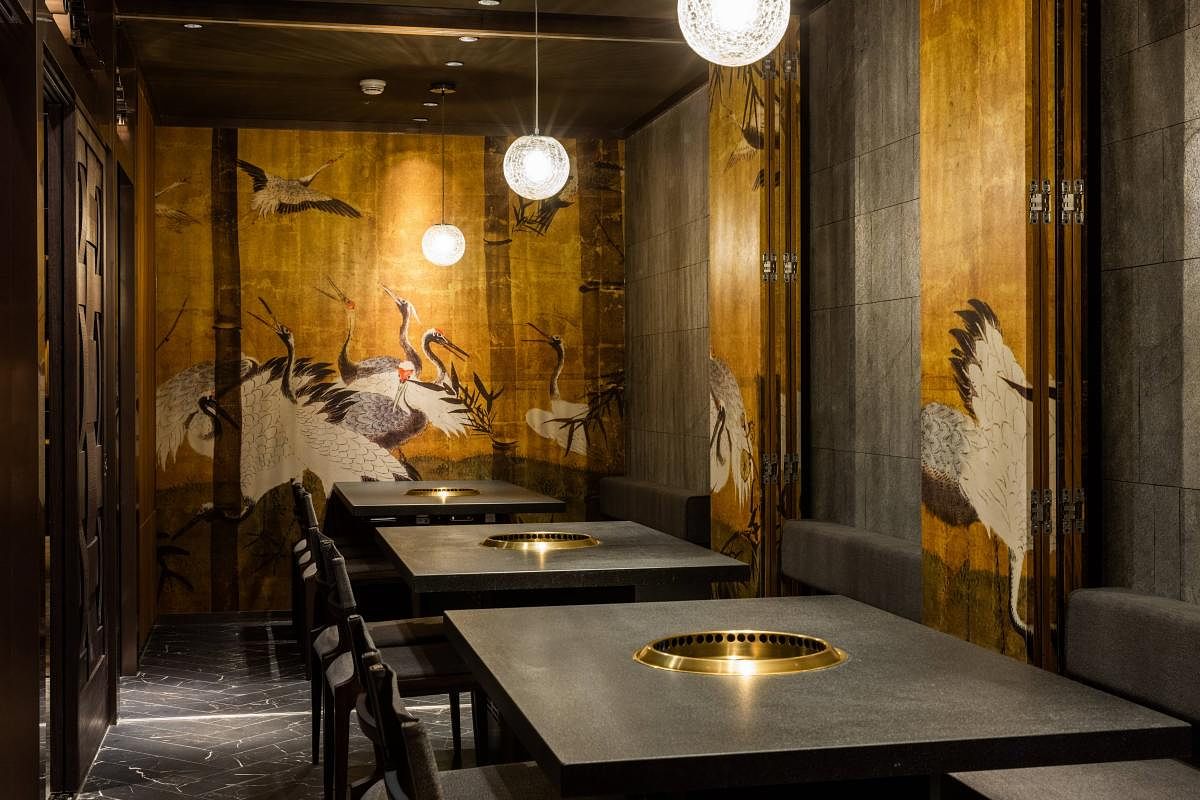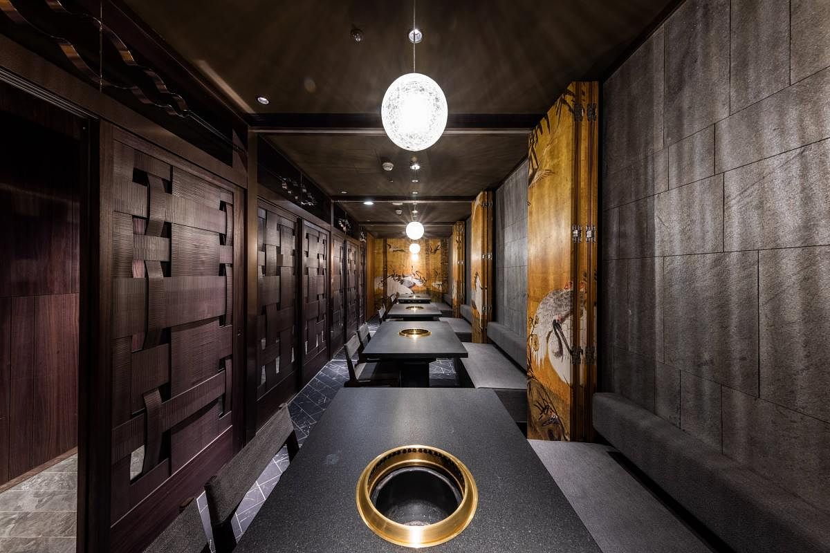目前全台共有15間老乾杯分店,其中的「老乾杯SOGO復興店」主要設計為4~6人開放式座位,空間設計運用鏡面牆、金色箱型鏡面燈,透過鏡面的反射延展,串起整體空間虛實交錯的迷幻奢華感,在此氛圍下品味頂級和牛燒肉饗宴更是享受。