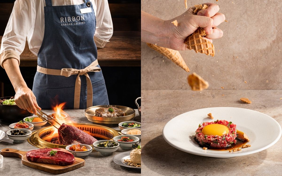 Ribbon醴本遵循韓國文化,有9款韓式小菜搭配時令生菜及韓國菜醬,並且可無限續盤,無論單吃或搭配燒肉以生菜包食都可以。視覺系前菜「生牛肉甜筒」取日本A5和牛細工手切,淋上調和鳳梨、蘋果醋、檸檬、青花椒、蒜頭、麻油等水果與香料的特製醬汁,拌入生蛋黃再捏碎脆皮甜筒,享用柔嫩鹹甜生牛肉與脆餅交織的多重口感。