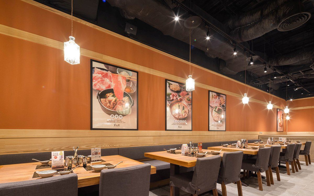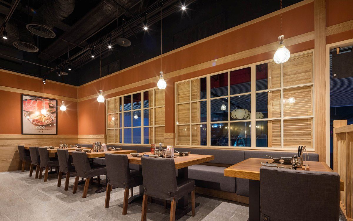「黑毛屋 新竹巨城店」位於新竹Big City巨城購物中心7樓,45坪空間共56席,設有吧檯、雙人與四人桌,間距寬敞,客人煮鍋時也能保有舒適的空間。店鋪設計比照以往的日式和風風格,茜紅色土壁搭配淺色系木樑、格柵,呈現散發溫暖木調的靜謐感。門面特別設計兩扇搭製梯形雨棚的開窗造景,清新可愛的仿戶外設計讓人彷彿走在日本街頭。