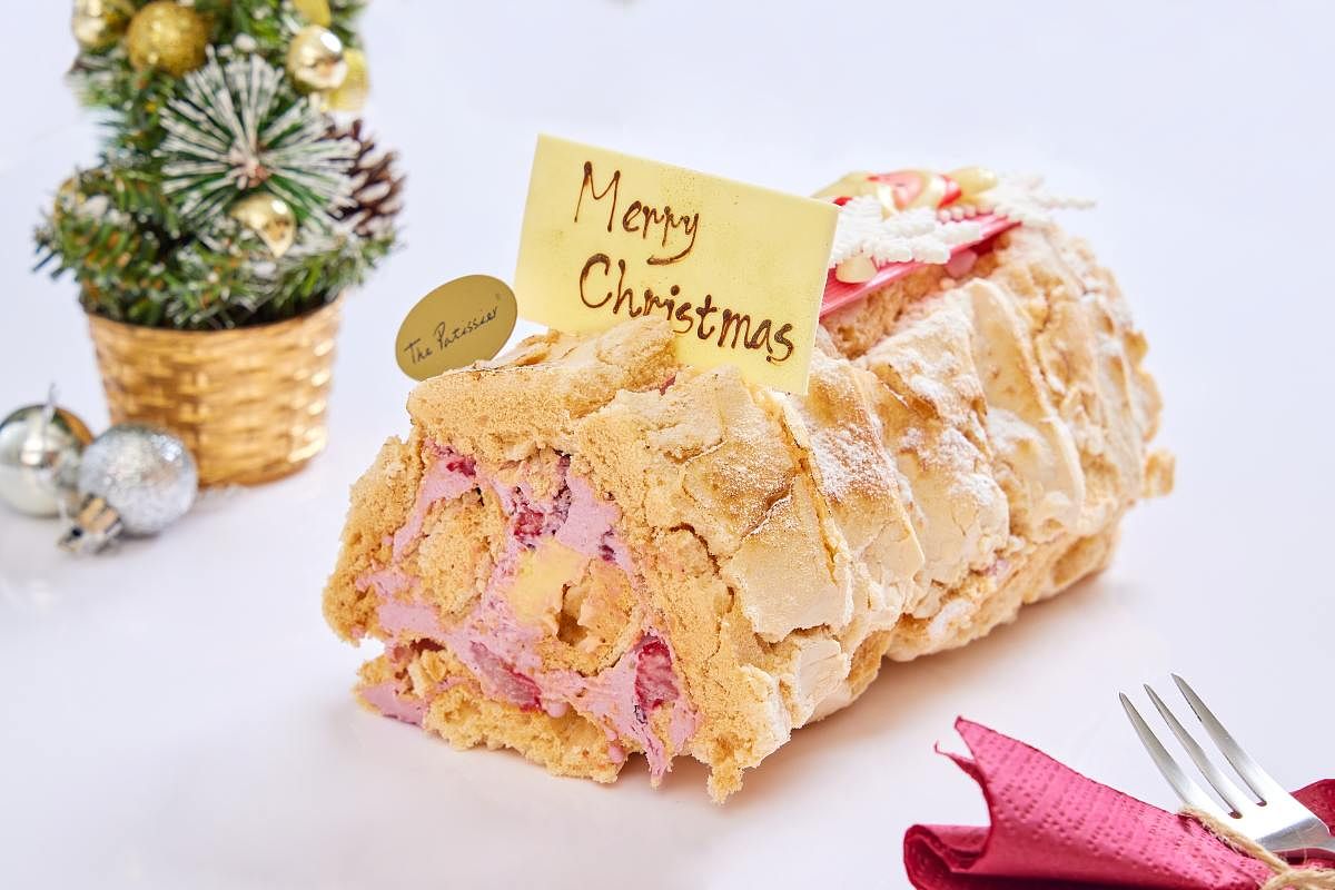 除了聖誕泡芙塔,在 The Patissier 的「蛋白霜蛋糕」也很受歡迎!適逢台灣草莓季,The Patissier 台灣旗艦店限定推出聖誕莓果蛋白霜蛋糕。The Patissieer 以空氣感十足的法式蛋白霜為蛋糕主體,厚厚一層 1.5 公分的蛋白霜糕體上鋪滿莓果慕斯及新鮮切丁草莓捲起,表層因捲時的張力自然產生裂痕,就像樹幹一樣!