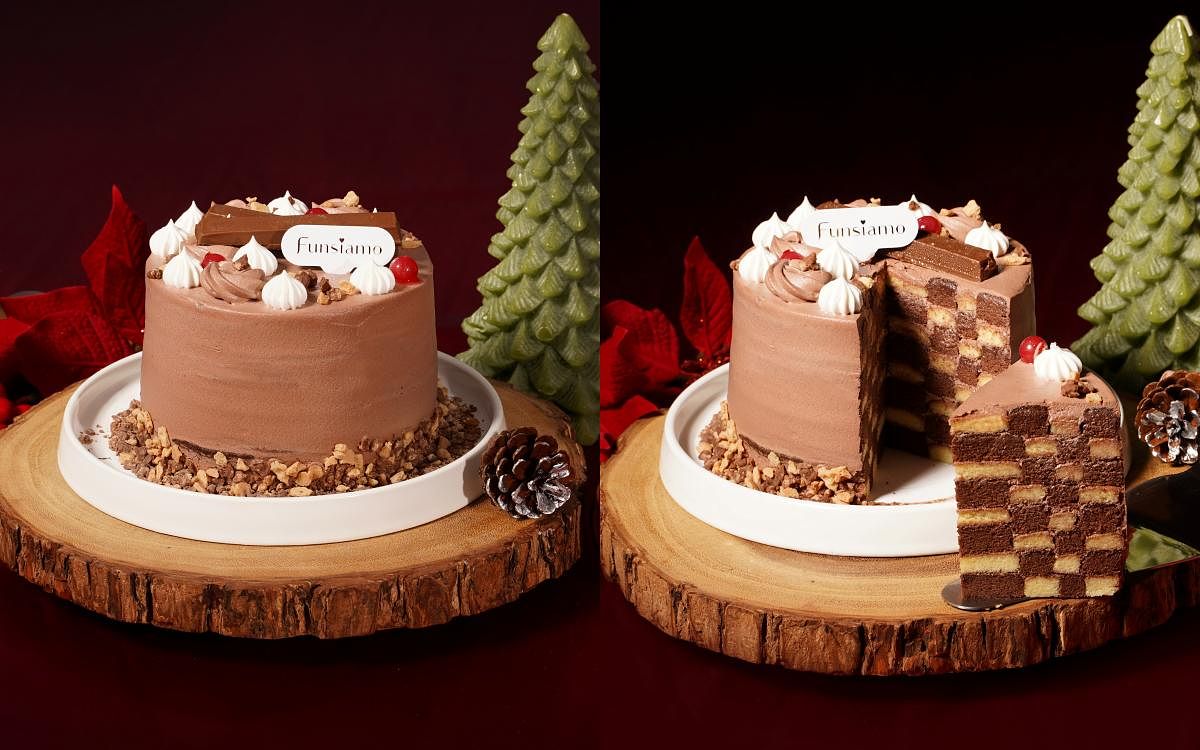 提供一站式自助服務的烘焙品牌—Funsiamo,推出『冬日甜蜜饗宴』限定甜點,首先推薦「愛神之吻紅絲絨蛋糕」。以經典紅絲絨蛋糕為主體,使用酸甜藍莓果餡作為夾心,其中還加入清爽滑嫩的手作奶酪,蛋糕頂部則使用紅醋栗及迷迭香錯落堆疊,製成聖誕花圈造型,入口鬆軟溼潤,巧克力的濃厚與紅醋栗的酸甜相互交織。