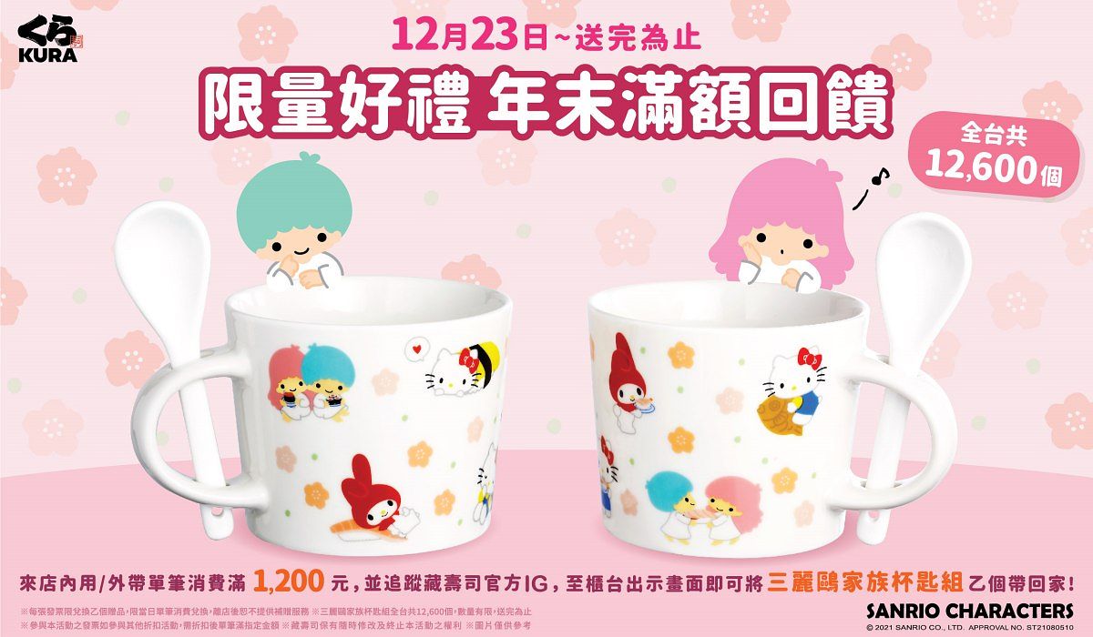 為感謝廣大粉絲熱情響應「藏壽司x三麗鷗家族」的限定聯名扭蛋推出後,藏壽司決定於平安夜前夕,再攜手超人氣巨星「三麗鷗家族」,共同送上最可愛的聖誕禮物給全台藏友!12月23日起凡至全台藏壽司單筆消費滿1,200元,並按讚官方Instagram,就能立刻把「三麗鷗家族杯匙組」帶回家,此回饋好禮除了實用性滿分外,杯身上還有著HELLO KITTY、雙星仙子、美樂蒂與藏壽司經典餐點的Q萌圖案,勢必將成為聖誕壽司大餐的最佳驚喜!