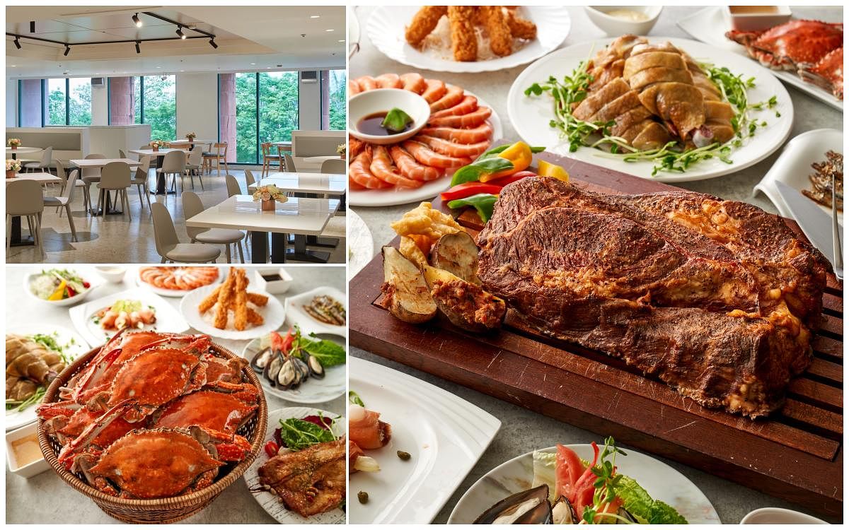 自助餐檯菜色升級:開胃菜冷盤類精選5道,老滷茶香煙燻雞、捷克煙燻鮭魚莎律、德式洋芋沙拉、白蘭地野菇沙拉米及經典生菜沙拉吧,主食推薦「現切爐烤肋眼牛排」、「炙烤蜜汁火腿」,還有暖心又暖胃「松露牛肝菌菇濃湯」。