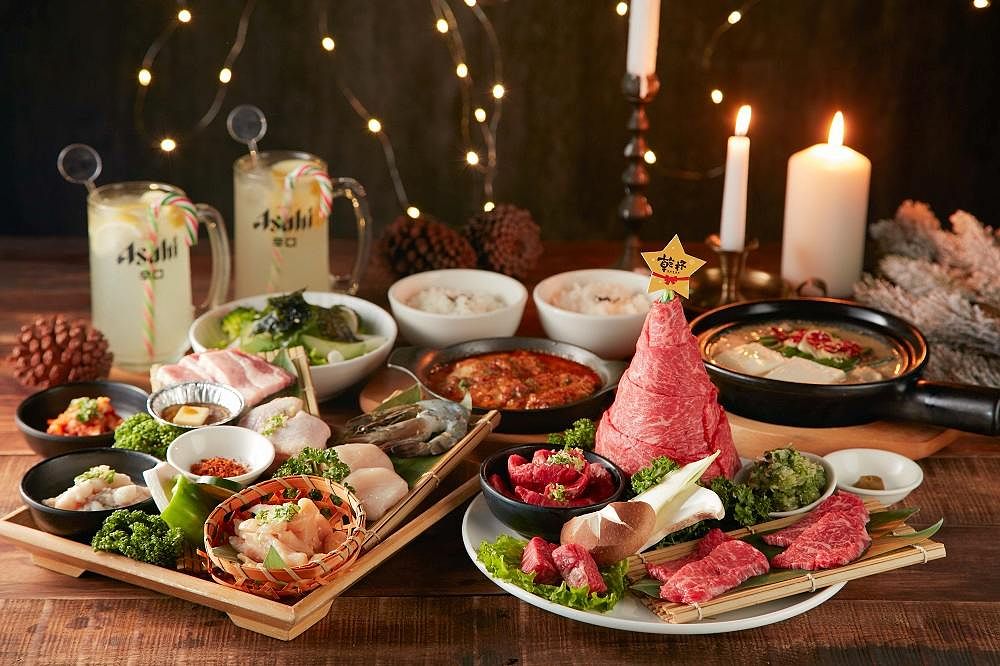 最會炒High氣氛的「乾杯燒肉居酒屋」,於12月21日至1月2日推出「聖誕跨年派對套餐」,今年主打霸氣十足的和牛拼盤,其中以鋪滿6片鹽蔥燒的「聖誕樹」最為吸睛,另外還集結澳洲和牛3款牛五花、鹽昆布上等角切、台灣豬五花、奶油雞腿肉、草蝦、干貝等海陸食材,再搭配乾杯自家泡菜、沙拉等前菜一同享用,一口氣可以吃到近20種不同的頂級菜色,雙人套餐2,280元、四人套餐4,680元+10%服務費,CP值超高。