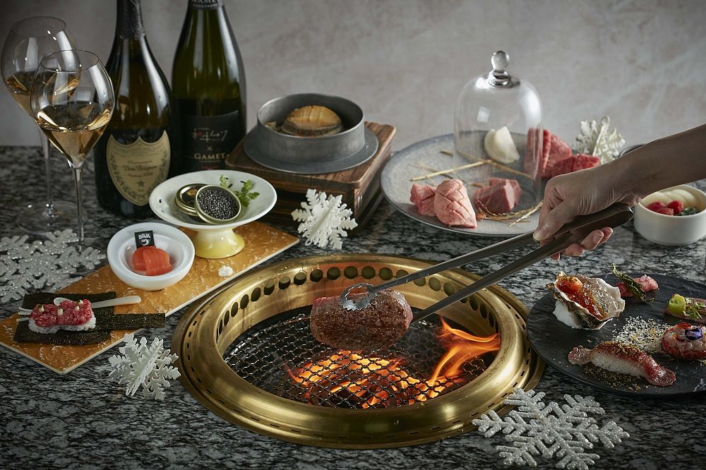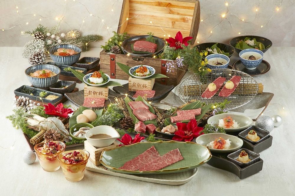 燒肉品牌「老乾杯」於12月21日至1月2日推出以「銀冬の蔵」為主題概念,祭出「聖誕豪牛套餐」,打造寶藏般的頂級和牛珍膳,集結限定熟成冷藏牛舌、和牛牛五花、和牛角切、牛肚、老乾杯雲丹和牛壽司、老乾杯紛雪燒、特選和牛姿切燒等7款頂級肉品,另外還有富有夢幻級口感的日本和牛上等牛排,直接以裝飾聖誕紅的耶誕寶盒端上桌。