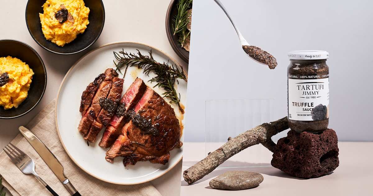 「Tartufi Jimmy松露義大利麵醬-原味」松露產地來自義大利綠色心臟的翁布里亞Umbria,以義國廚師黃金3%夏季松露比例調和,直接簡化松露烹調的繁複程序,輕鬆呈現五星級餐點。主餐建議選擇大理石紋路的牛小排,於平底鍋加入奶油香煎3~4分鐘並靜置均勻受熱後,粉嫩肉汁搭配松露佐醬能感受到松露瞬間綻放出撲鼻的迷人香氣,松露的蕈菇口味基底更能襯托牛肉鮮甜,亦可將松露醬點綴於兼具美味又健康的滑嫩歐姆炒蛋,加入一小匙即可讓蛋香純粹晉升成為色香味俱全的異國佳餚,從入口到咀嚼,處處都有著不同層次的美味。