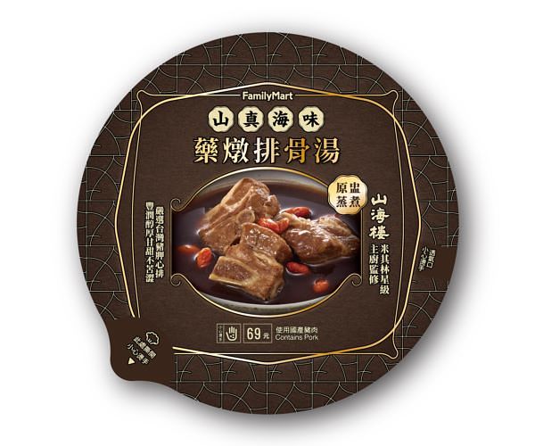 因應冬季氣溫降低,全家與山海樓聯名,冬日補湯溫暖上桌!由山海樓主廚監製的「藥燉排骨湯」,排骨特選台灣豬胛心排,加入數種中藥材慢火熬煮排骨湯頭,湯品口味醇厚,散發濃濃藥膳香氣,最適合在天氣冷時進補食用,售價69元。