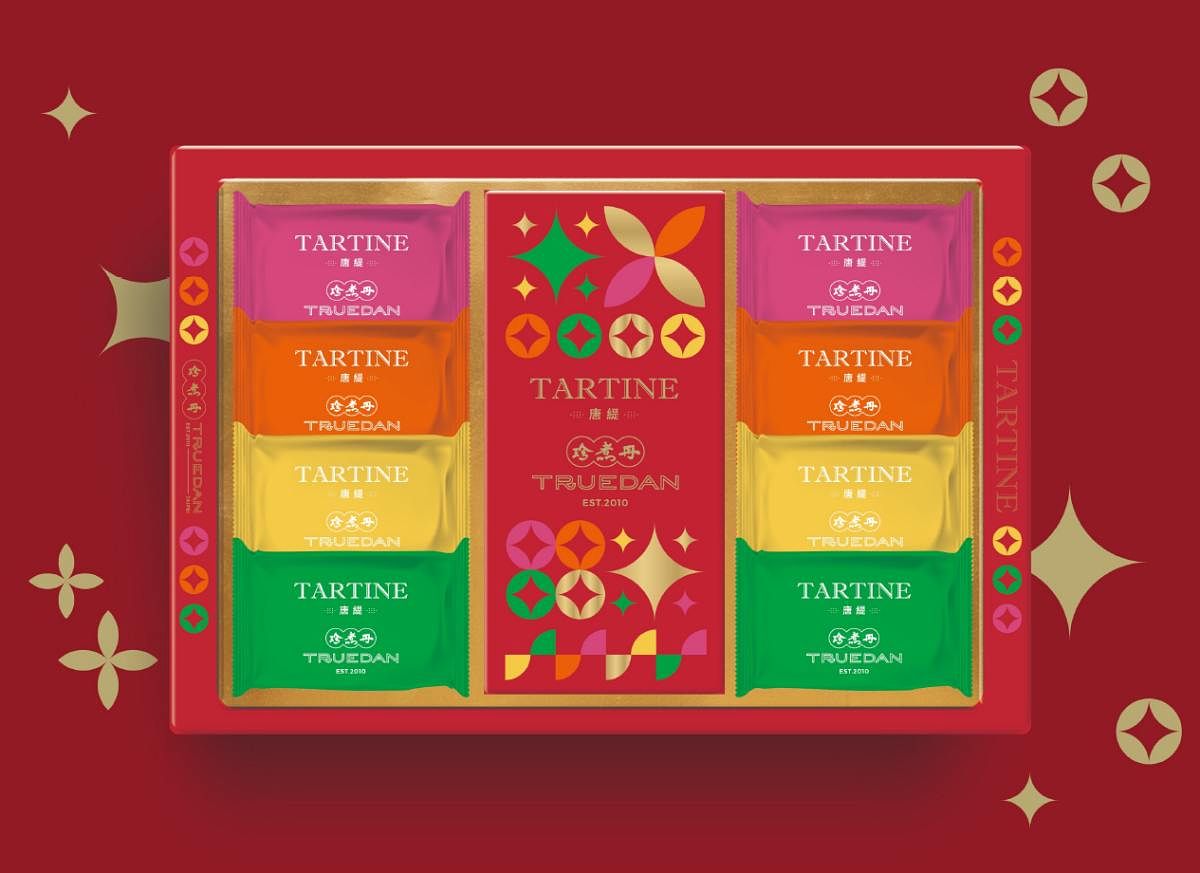 TARTINE唐緹推出與珍煮丹聯名新推春節禮盒,首創獨家黃金皮製作與創新內餡打造最獨特的時尚伴手禮禮盒,由唐緹師傅獨家精製,嚴選珍煮丹百年老廠黑糖製作並結合唐緹熱銷的流芯餡料,四大獨創口味:福壽磚、紫芋流金磚、旺來磚、牛奶甜芯磚每種口味各2入並結合唐緹熱賣商品黑糖好棒棒,時尚感的外盒及富有巧思的錢幣,代表事業發大財,金虎年成果豐碩。