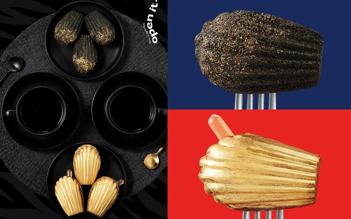 瑪德蓮專門品牌「open it」首次為新年創作的期間限定新品,以奢華的黑金主題在包裝上用黑金虎紋代表虎年的到來,使用台灣年節珍貴的代表性食物「野生烏魚子」入甜點,推出烏魚子口味的「烏金酥苔」瑪德蓮,與金箔巧克力的「箔金醺巧」瑪德蓮,一鹹一甜共兩種年節限定口味。