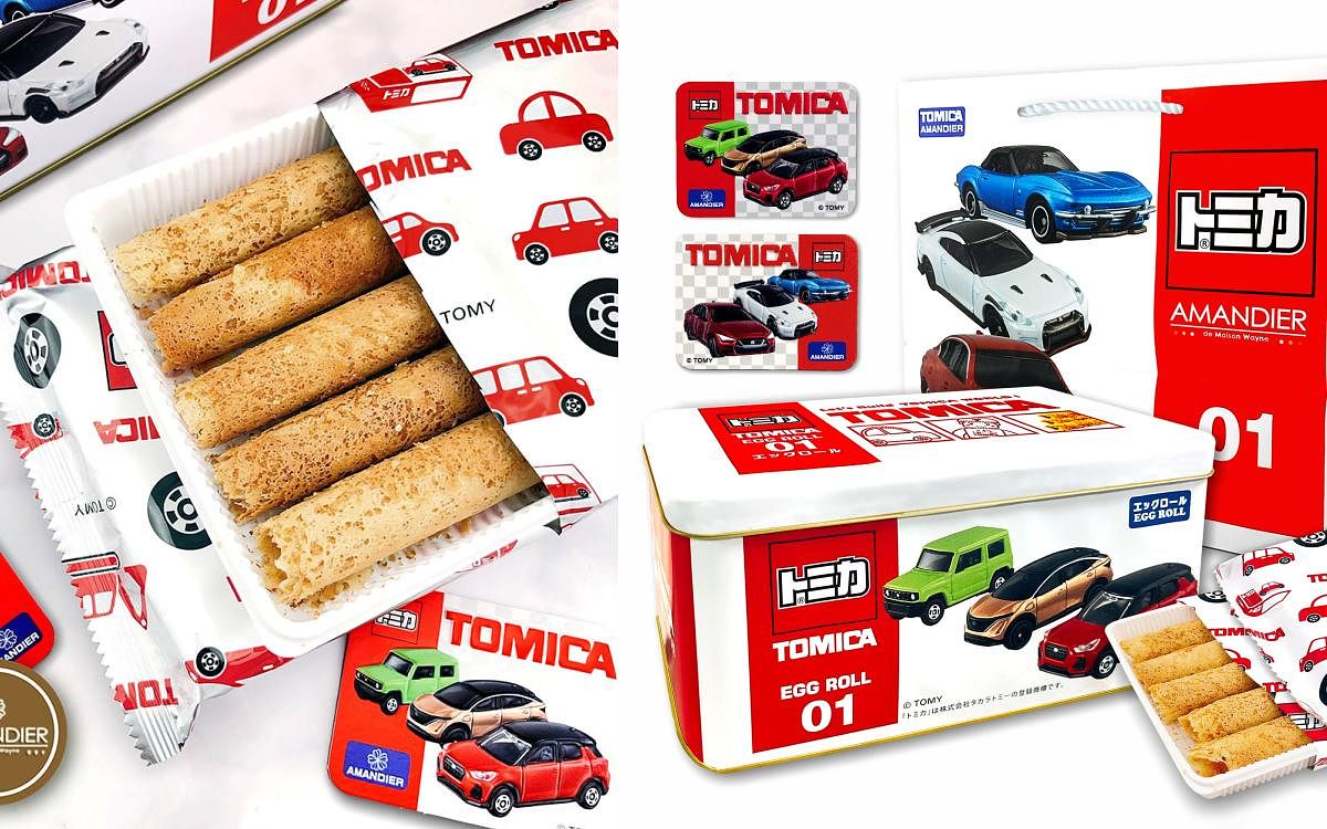 放大版的TOMICA小汽車鐵盒,經典紅白長方設計,各式精選車款集合亮相,甚至連內包裝都是滿滿的小汽車圖鑑。帶有濃郁雞蛋香的多層酥脆蛋捲超美味,還隨機附贈造型磁鐵一個。